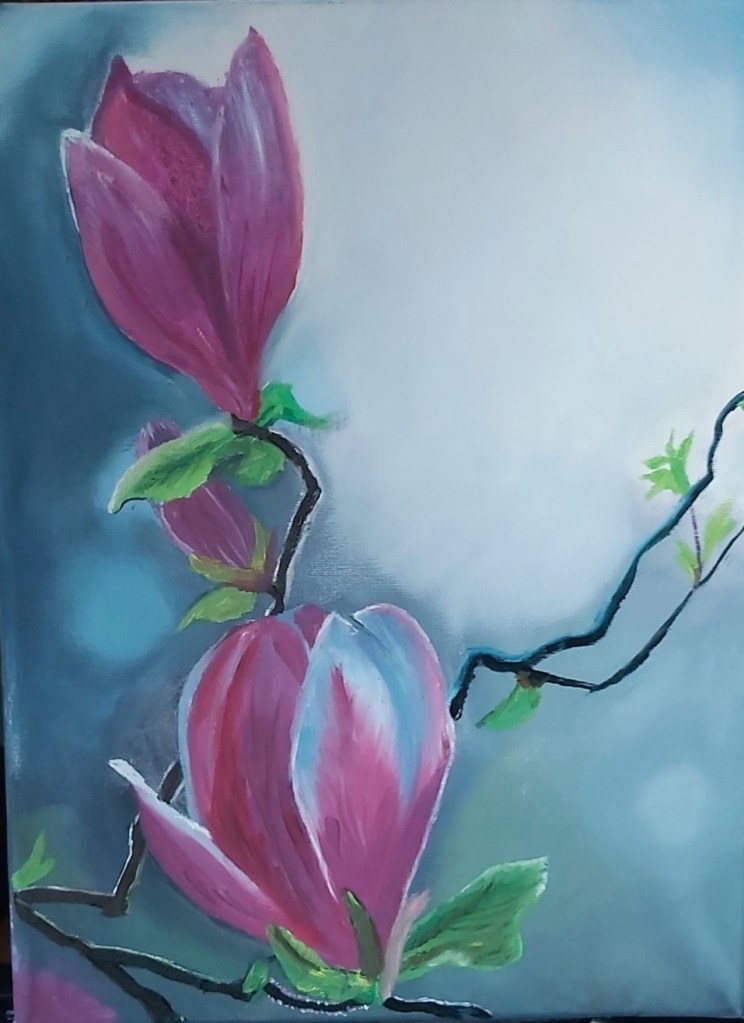 Magnolien „ gemalt nach MK O.Bazanova, 40x30x1,5 cm, Ölfarben, Leinwand gespannt. Preis 130 Euro. Das Bild ist nicht mehr verfügbar, kann aber nach Bestellung gemalt werden.