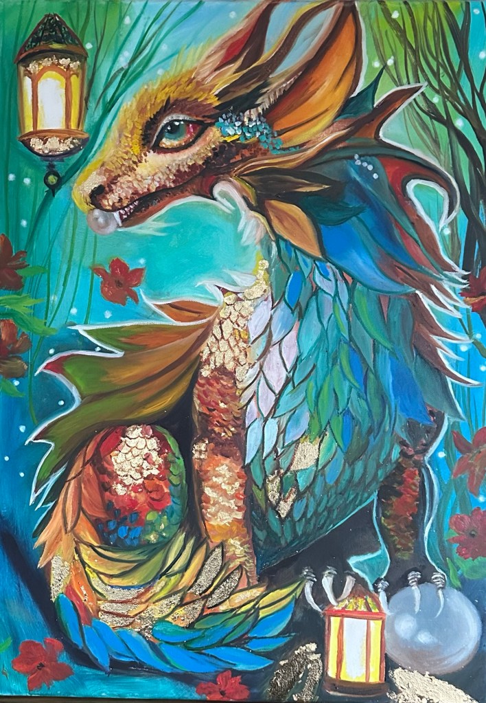 Die Perle im Maul des Drachen symbolisiert im chinesischen Kalender die Erfüllung von Wünschen. Der Drache mit der Perle in seiner Hand soll Harmonie und Weisheit verkörpert. Mögen all Eure GUTE Wünsche in Erfüllung gehen. 70x50x1,5 cm. Ölfarben, Leinwand gespannt. 2023 Das Bild hat 2. Platz gewonnen im Wettbewerb „Golden Time Talent „ in London.
