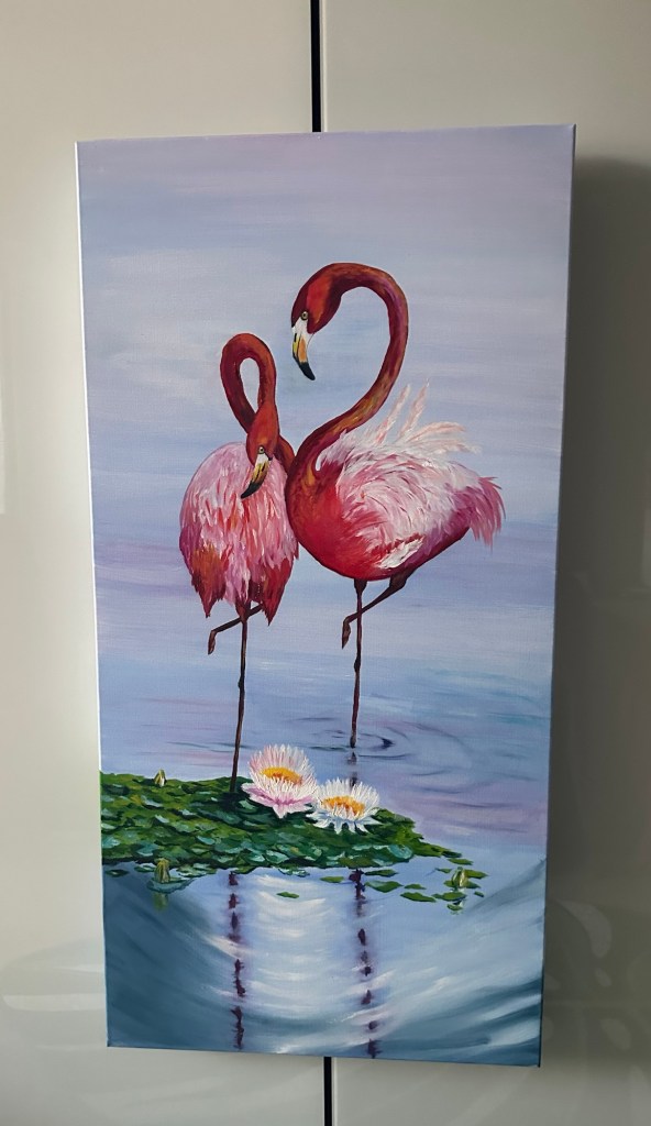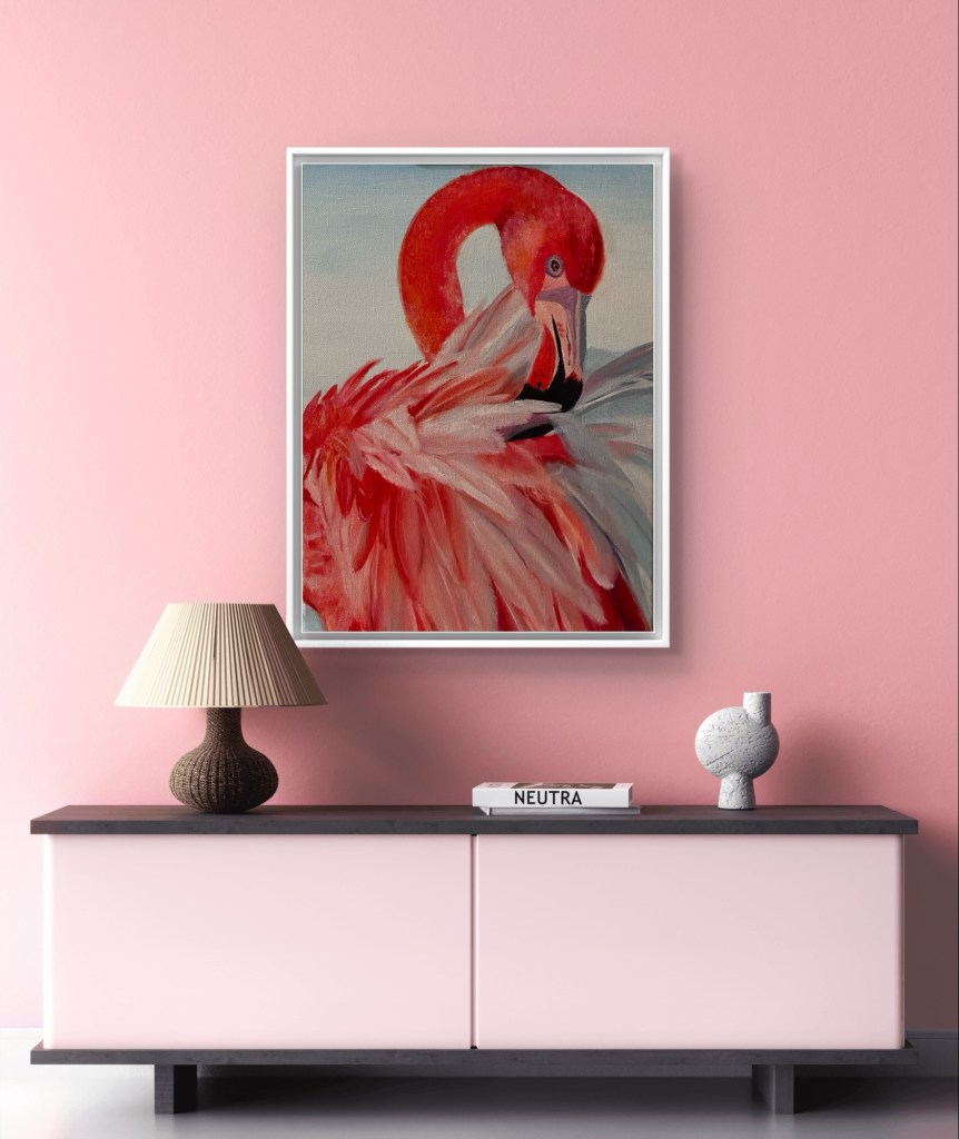 Ein Spiel lebendiger Farben und die anmutige Energie eines Flamingos – festgehalten auf meiner Leinwand.